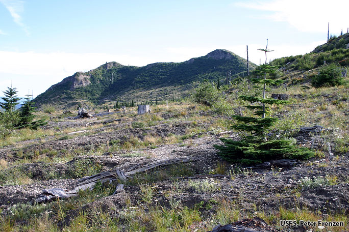 Same view showing areas buried by landslide and scoured by the lateral blast [3 months after eruption]