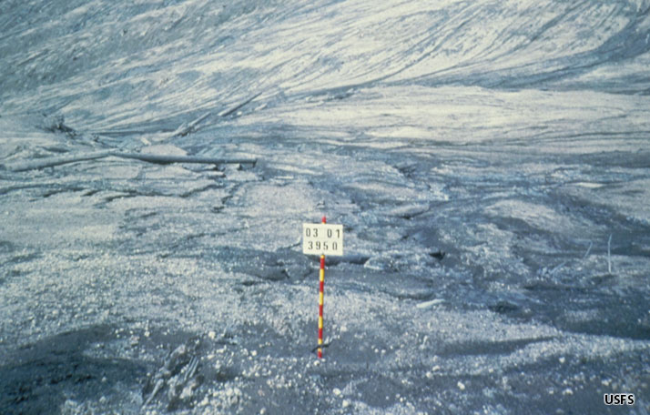 Same view, trees were uprooted by the blast and deposited on the far side of the ridge [3 months after eruption]